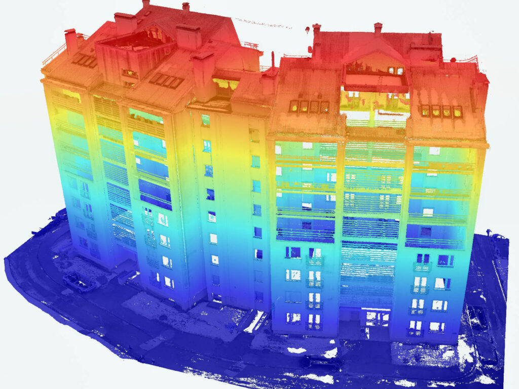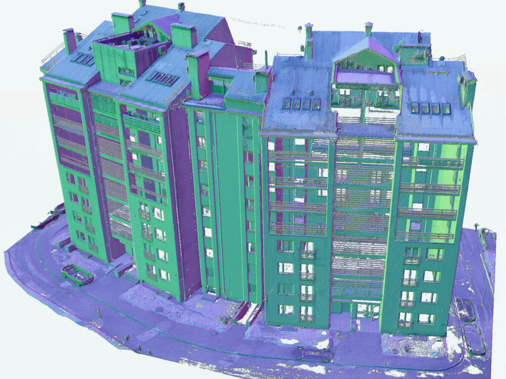 Lāzerskenēšana nodrošināja precīzus fasāžu, balkonu un apjoma datus, savukārt drona uzmērījumi ļāva droši un ātri iegūt jumta plakņu un tehnisko elementu ģeometriju.